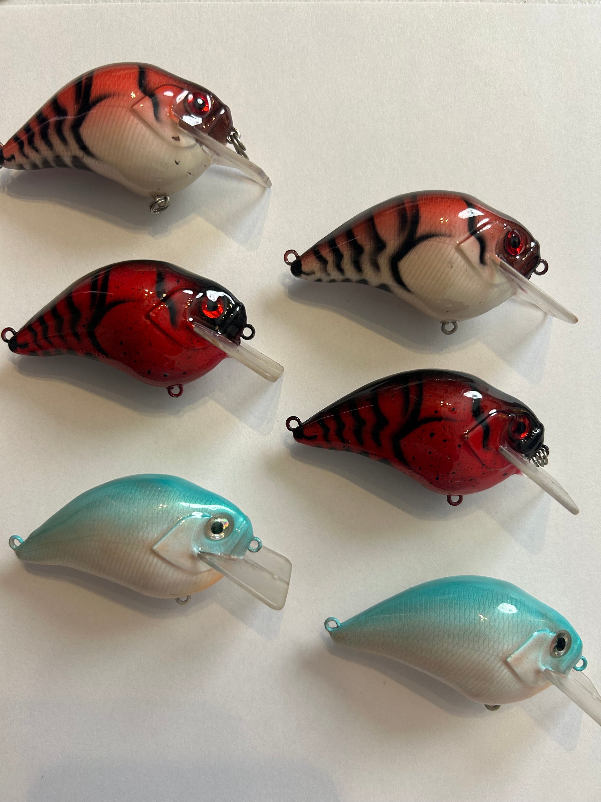 Custom painted MegaBass S Cranks, each is custom airbrushed then sealed with 2 ton epoxy. Lures are plastic and feature rattles